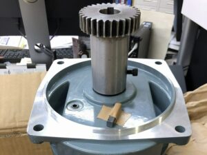 旧型のステージ回転用ギアモータが過負荷で破損し、交換が必要となりましたが、モデルチェンジにより新旧モータのギアシャフトに互換性がありませんでした。納期が5日以内と短く、キー溝加工では間に合わないため、急遽90°に2箇所のセットボルトを設ける回り止め加工で対応。内径$\Phi 28.0H6\Phi 44\times 110L$のギアシャフトを4日間で加工完了し、工期に間に合わせました。