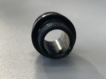 内径には左ネジタップが立てられていたので、アタッチメントの外径に左ネジ切り加工をしました。反対側には、ローレット加工を施して、黒アルマイト処理をしてユーザーテストを行っていただきました。ユーザー様に圧入の感覚を確認していただき、外径を基準にプラス目・マイナス目の物を作成し、繰り返しの製作を行いました。