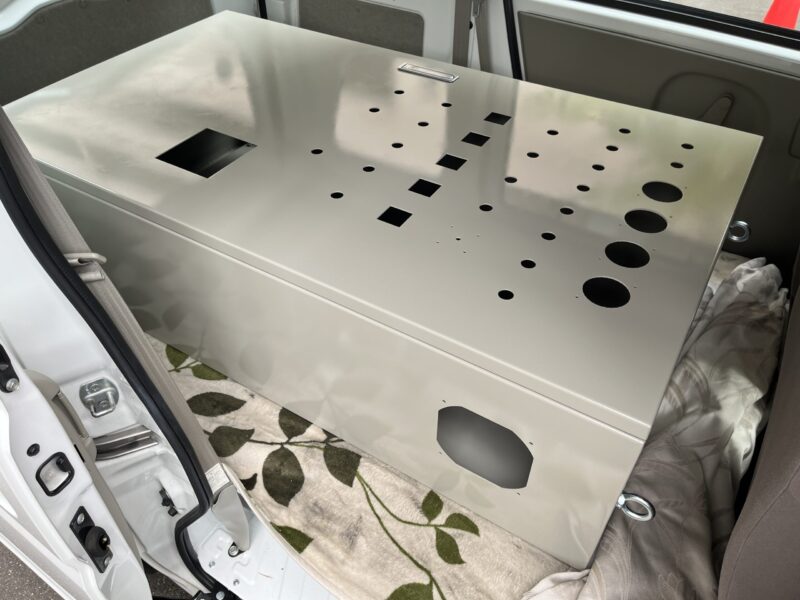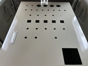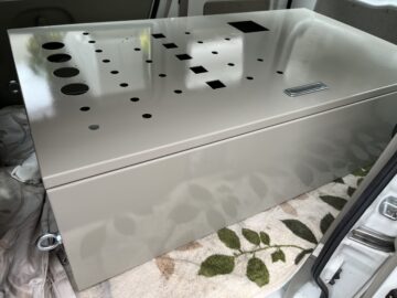 お客様の設計図面に基づいた板金製作で、シューカーハース形高温炉の自動化専用機に使用せれる為、屋内防塵型の仕様での製作です。塗装仕上げは5Y7/1色で、可変抵抗取付板t2.3XW70XH240の板金板とセットで完成品に仕上げました。