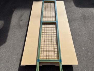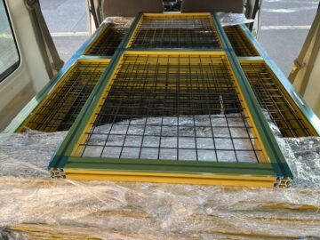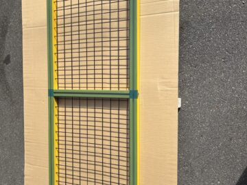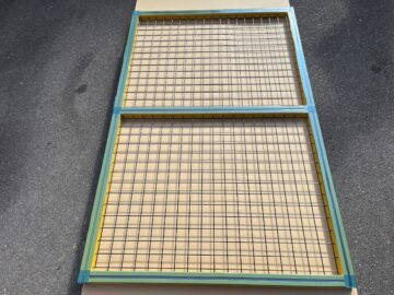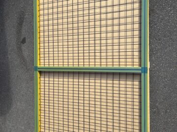 40角のアルミフレームを使用し、高さ1580mmの枠の上下に線径Φ3.2×ピッチ50mmのフェンスネットを組み込み、様々な幅の安全柵を製作いたしました。また、高さ1945mmの安全柵用として、高さ1950mmの吊り下げ扉も製作しております。