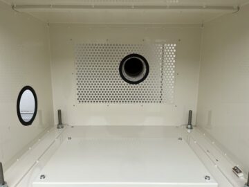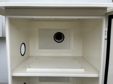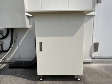 印刷加工業であるお客様が導入されるアクリルレーザー加工機に付属する送風機専用の設置ケースの製作を依頼される。室内使用の送風機だが、アクリルの焼ける匂いが加工場に充満するため、屋外に匂いを排出したいとの事。屋外で雨風に掛からないようステンレスの防水仕様で箱を製作。また送風機の熱がこもらない様にステンレス箱内の排熱が出来るよう設計。加工場室内のレーザー加工機から来るダクトを通るが外壁の穴に合わせてステンレス箱を設計しないといけない為、現地での調査を行いながら全体の設計を行う。外壁の色に合わせて2.5Y9/1のクリーム色の塗装に仕上げる。