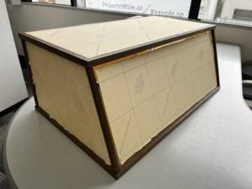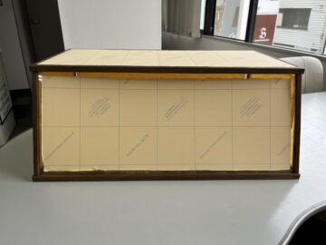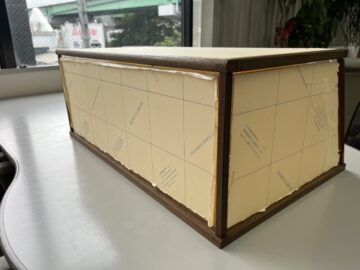 徳川美術館に出品される作品の観賞用ケースの製作を依頼されました。現在お手持ちの縁取りの木枠を使用して製作してほしいとので、設計から行いました。木枠に合わせた形状を設計し、木枠組みがバラバラにならないよう、接着組み立てを行います。その後、アクリルを透明テープにて外れないように固定。観賞用ケース自体が動かないように底面にスベリ止め加工も施して完成。立ち合い検査にて、展示品の受け皿と写真でご確認頂きました。